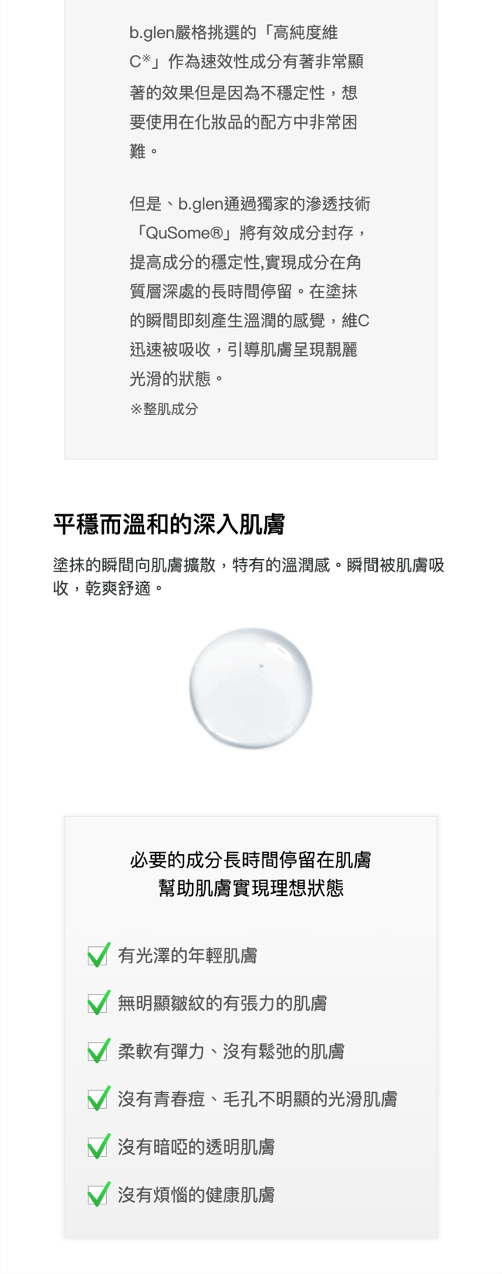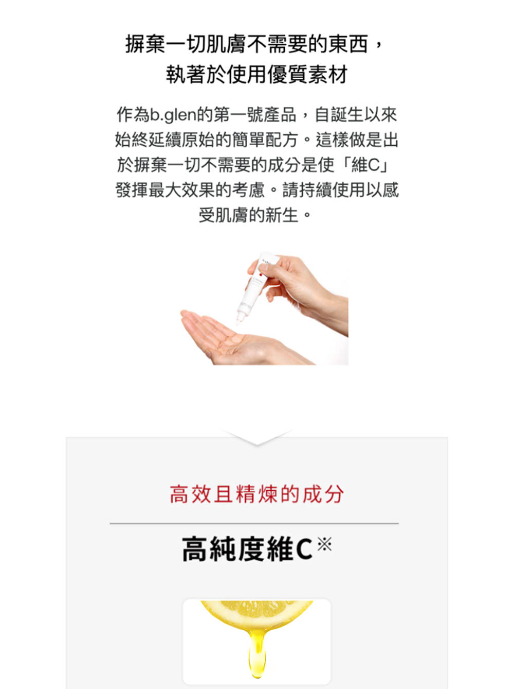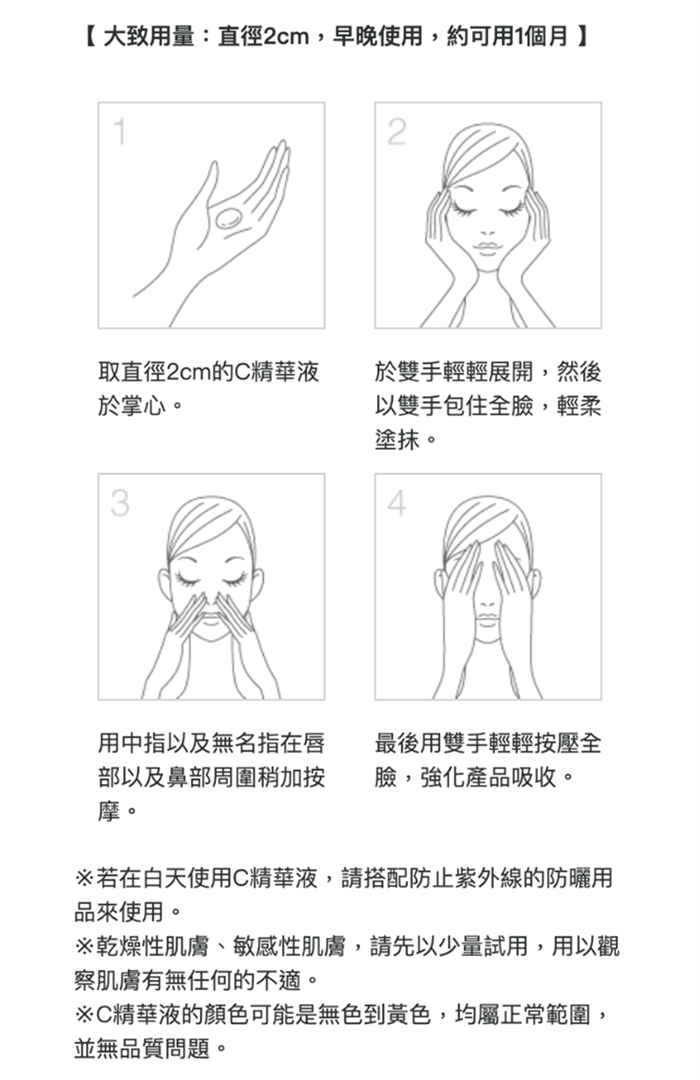 維他命C是可對肌膚的不足做出迅速反應並及時應對肌膚問題的美容成分。在敷抹的一瞬間,即刻產生一種溫潤的感覺,這是由於超微膠囊化維生素C迅速被吸收,滲入肌膚深處的角質細胞層的緣故。維他命C精華可平衡皮脂分泌,修護肌膚成分,讓肌膚平滑晶瑩有彈力。有效解決皺紋、下垂、青春痘、痘印、毛孔、色斑和暗啞等肌膚問題。