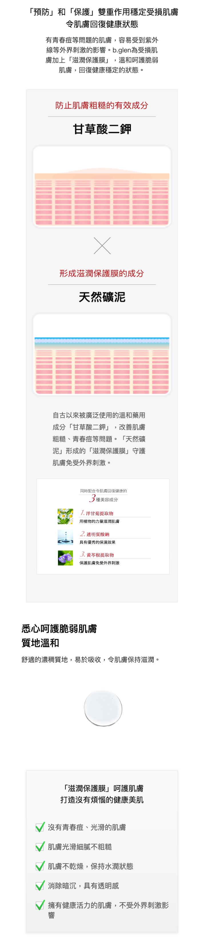 具有「預防」和「保護」雙重作用,肌膚無負擔的化妝水。採用歷史悠久的溫和天然成分「甘草酸二鉀」,預防青春痘和肌膚粗糙。天然礦泥「蒙脫土」形成滋潤保護膜,抵禦外界刺激。化妝水質地濃稠卻易於吸收,為肌膚帶來更安心的保護。