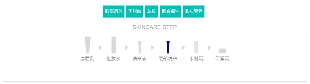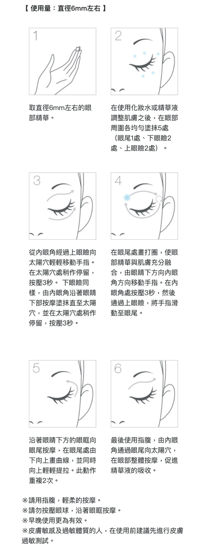 運用最新配方的眼部精華,針對因年齡秙乾燥而產生的眼部細紋*1和鬆弛,長時間使用手機、電腦令血液循環不暢而惡化的黑眼圈,解決現代人眼部肌膚提早衰老的煩惱。首創眼部肌膚護理成份,滲透至角質層深處,配合按摩手法改善血液循環,不懼年齡和壓力,令眼部肌膚滋潤飽滿,回復亮彩。